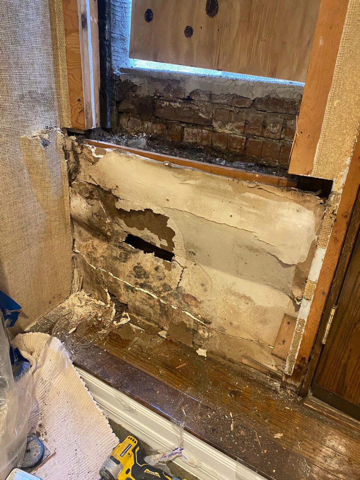 Water-damaged window area repaired with structural wall restoration and professional window replacement, eliminating moisture damage and restoring durability.