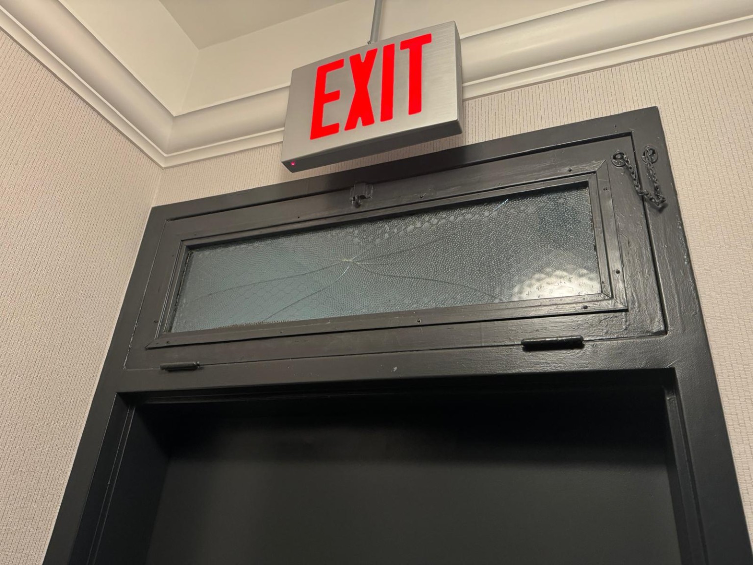 Damaged transom glass above a commercial exit door replaced with a secure new glass panel, restoring safety, visibility, and proper door operation.