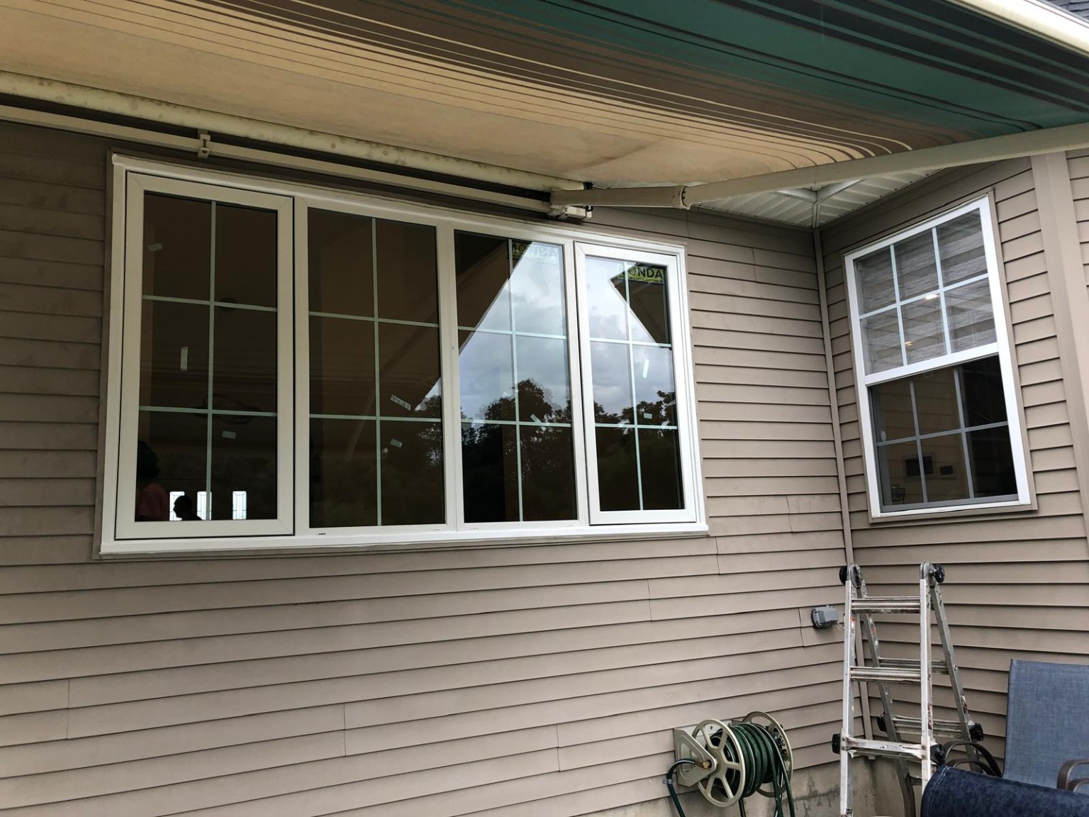 This project involved converting a section of a rear exterior wall into a large window opening and installing a wide multi-panel vinyl window system. The work required removal of existing siding, creation of a new rough opening, installation of the window assembly, and restoration of the exterior wall finish.